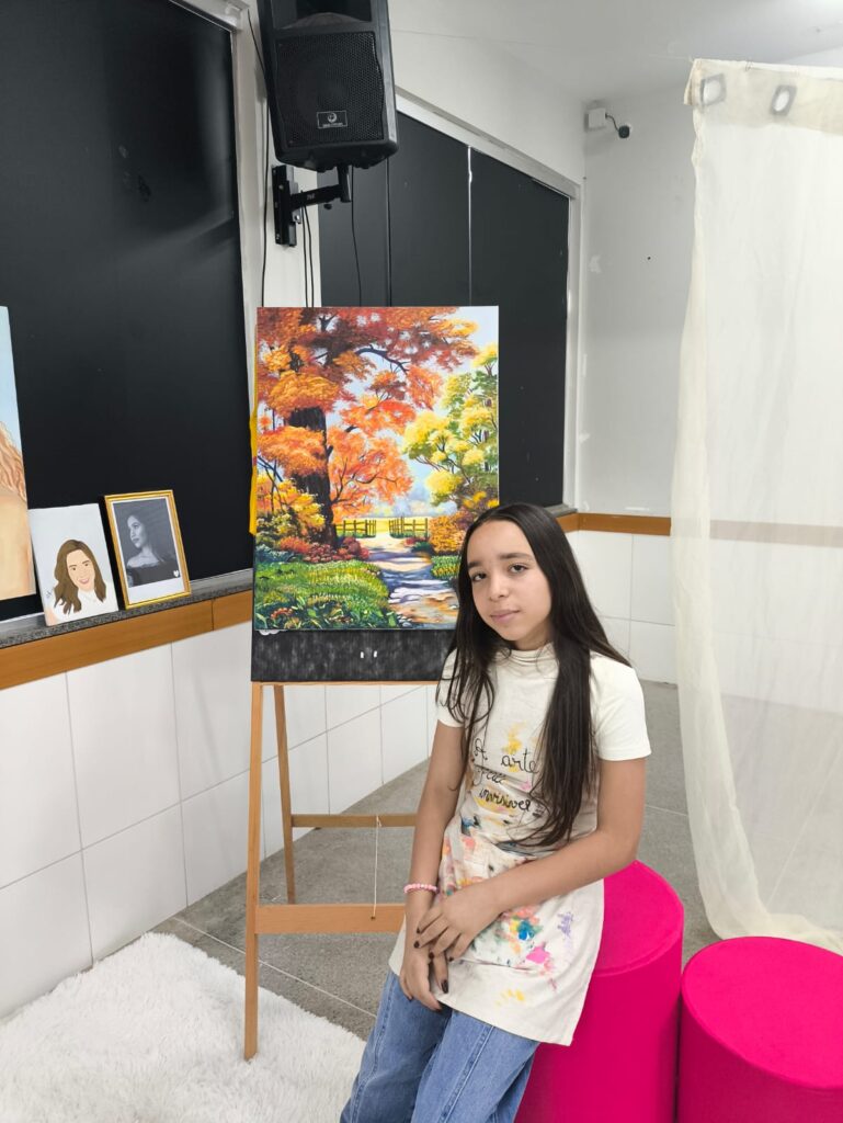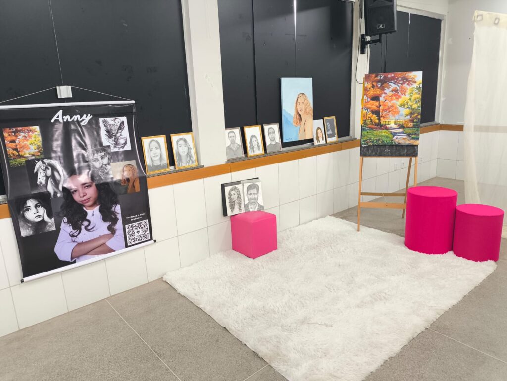 Ela apresentou suas artes, falou sobre criatividade e compartilhou sua história, encantando os estudantes com seu talento e carisma.